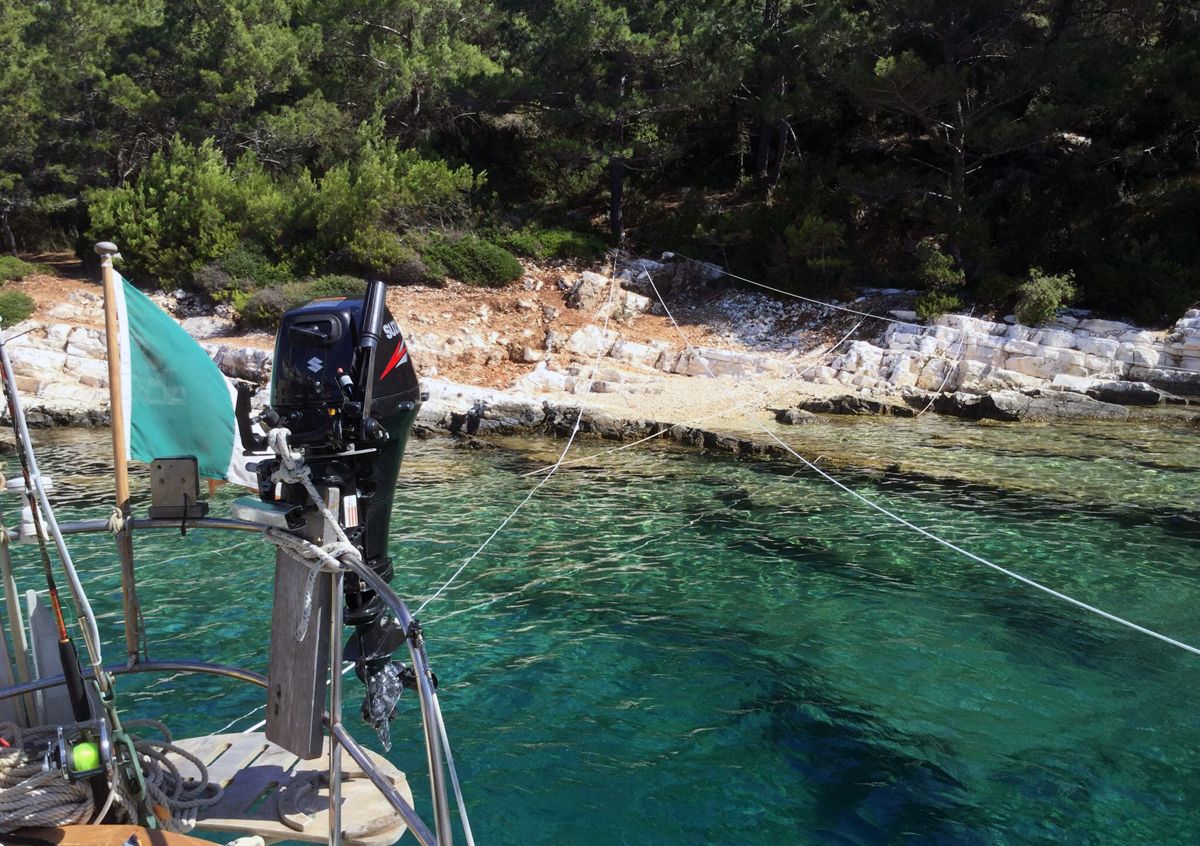 Lorsque l'eau est très profonde et que le rivage autour d'une baie est abrupt et escarpé, il n'est pas toujours pratique, sûr ou possible d'utiliser des ancres de bord, et l'amarrage du bateau à terre devient alors la seule option viable. L'ancre de rive est un outil qui peut résoudre de nombreuses situations difficiles, mais elle cache aussi quelques inconnues. Pour éviter de s'attirer des ennuis, il est important d'étudier la manœuvre à l'avance pour comprendre où vous allez mettre la ligne à terre et quelle longueur elle devra avoir. En partant du principe que vous n'utilisez pas la ligne à terre si le vent est très fort et que la vague entre dans la rade, vous n'avez pas besoin d'une ligne très épaisse pour relier le bateau à la terre. Une ligne d'amarrage d'environ 25 mètres de long est suffisante. Elle doit être mise à l'abri et correctement gainée dans le cockpit. Ensuite, le bateau de service est mis à l'eau, équipé du hors-bord prêt à l'emploi à l'arrière. A ce stade, vous donnez l'ancre sur le fond et vous vous assurez qu'elle tient. Vous vous positionnez ensuite avec la poupe vers le point où vous voulez qu'elle reste immobile. Une ou deux personnes descendent sur l'annexe et ramènent la ligne à terre pour l'attacher à un rocher ou à un arbre.