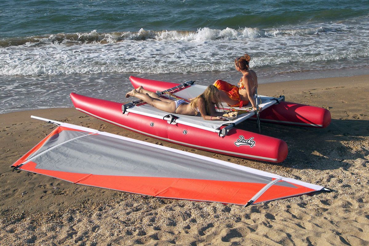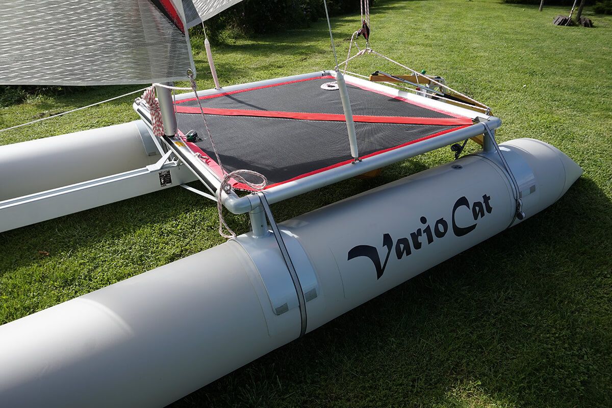 Pour ceux qui sont intéressés par les avantages pratiques des catamarans gonflables mais qui ne veulent pas renoncer aux performances de navigation, nous recommandons le VarioCat (4,55 m) de la société allemande du même nom, un modèle pour deux à quatre membres d'équipage qui se caractérise par son faible poids et son plan de voilure puissant. Les coques pneumatiques à profil bas sont en pvc avec une double chambre à air et une double soupape de sécurité. Le système qui relie la structure tubulaire en aluminium qui abrite le trampoline, les deux tableaux arrière et une barre longitudinale avec un seul gouvernail à l'arrière et une dérive centrale pivotante est particulier : la structure repose sur quatre selles (deux pour chaque coque) qui sont fixées au moyen de sangles.