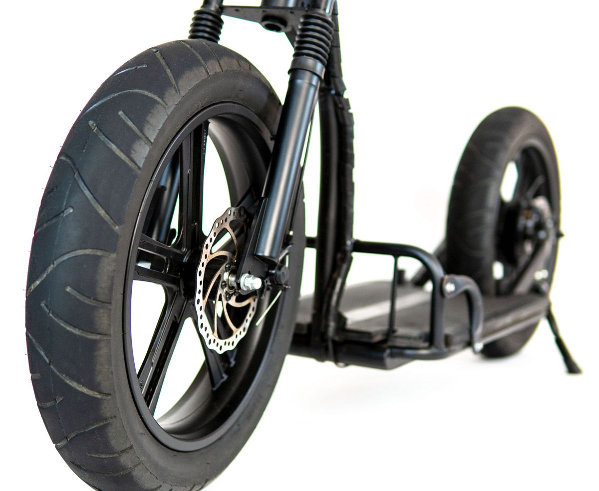 - Avec chambre à air. Semblables aux pneus de vélo normaux, bien que de plus petite taille, ils ont l'avantage d'absorber les irrégularités du terrain, de réduire les vibrations atteignant le guidon et d'augmenter ainsi le confort de conduite. C'est pourquoi, sur les terrains accidentés, ils permettent une meilleure tenue de route et une bonne adhérence, notamment par mauvais temps et sur sol glissant. L'inconvénient est le besoin accru d'entretien, car elles sont sujettes aux crevaisons et doivent être gonflées lorsqu'elles ont une faible pression. Lorsqu'une crevaison se produit, il faut démonter le pneu et réparer ou remplacer la chambre à air, une tâche qui n'est pas toujours facile, tout comme il n'est pas toujours facile de trouver des chambres à air de rechange.