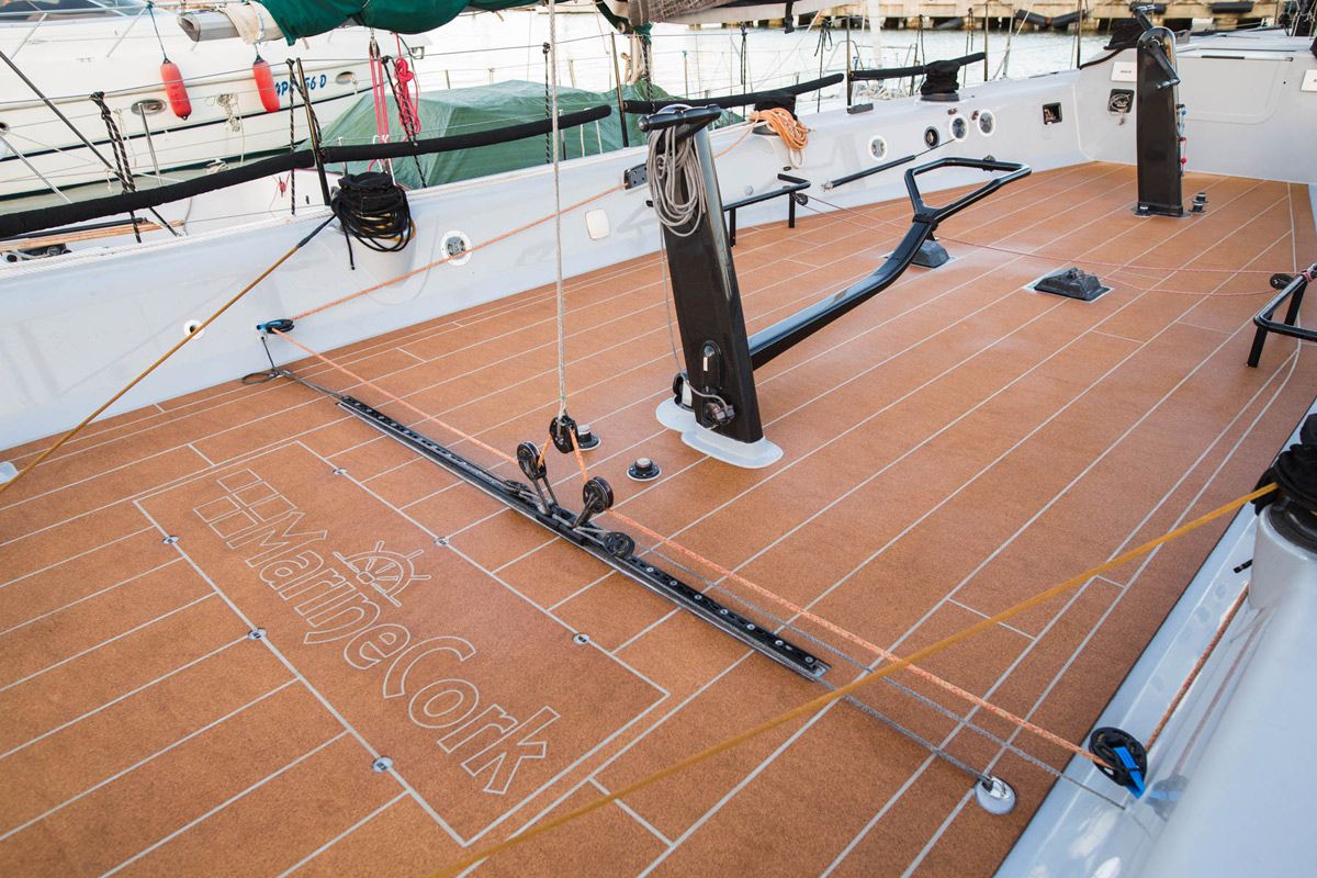 Un autre avantage est sa légèreté : 2,7 kg/m² contre 4,5 pour un bon teck synthétique et même 9 kg/m² pour un teck naturel de 2 cm d'épaisseur. Son faible poids le rend également adapté aux bateaux de course, par exemple : on l'a vu tout récemment sur le Transpac 52 ZeroCould, champion du monde Orc en 2017. Le liège possède également d'excellentes propriétés d'isolation thermique, de sorte que vous pouvez marcher pieds nus dessus toute l'année et à tout moment de la journée, même en plein soleil. Il permet également de maintenir une température constante à l'intérieur du bateau, ce qui signifie moins de chauffage en hiver et moins de climatisation en été.